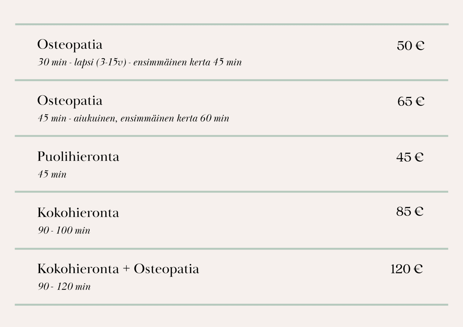 Ajan peruutus tai siirto tulee tehdä 24 h perutuista hoidoista ja peruuttamattomista laskutetaan hinnaston mukaan.